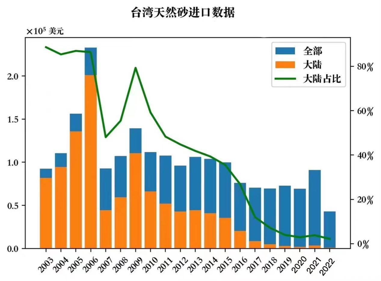 据公开数据显示,2008年台湾地区正常的砂石需求量是在6600万平方米,大概是9000万吨左右的总需求,而这其中有三分之一来自于河砂的开采,有三分之一来自于岛内陆上砂以及地下石的开采,剩下三分之一是从中国大陆进口。